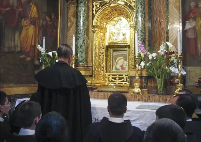 Algo similiar sigue obrando la Santísima Virgen a través de su fresco. Cuántas y cuántas veces las almas se desesperan ante sus miserias y faltas, y no saben a quién acudir para abandonar el vicio… No tienen fuerzas para reconocer sus errores y recibir el perdón de Dios. ¿Qué hacer? Simplemente, recurrir a la Madre del Buen Consejo. No siempre pronuncia palabras, pero habla con claridad por la acción de la gracia divina, más valiosa que todos los discursos. Basta con contemplar el fresco para que la inocencia perdida empiece a ser restaurada. A continuación, Nuestra Señora fortalece el alma para que busque un sacerdote y reciba, en el sacramento de la confesión, la consumación de la obra de misericordia iniciada por su purísima mirada.